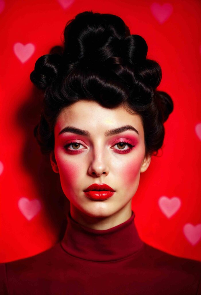 Soft pink highlights layered over a red and black base create warmth and softness. It’s less dramatic than pure red contrast and leans playful.
